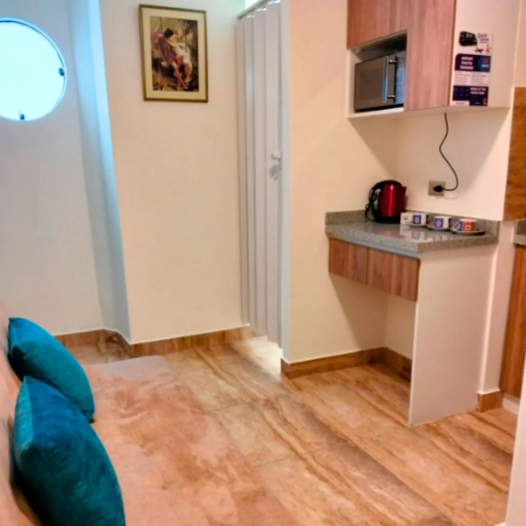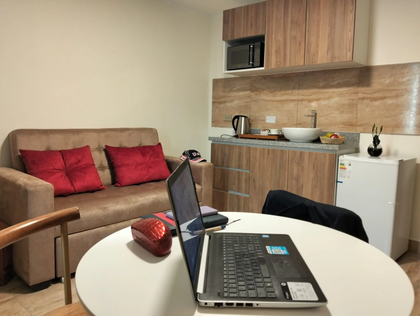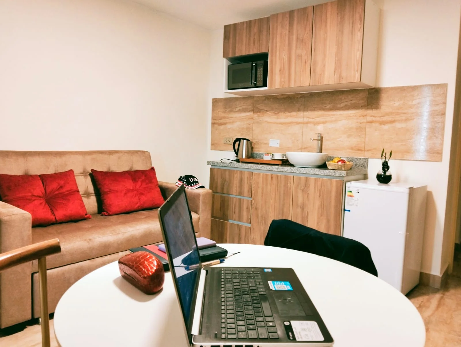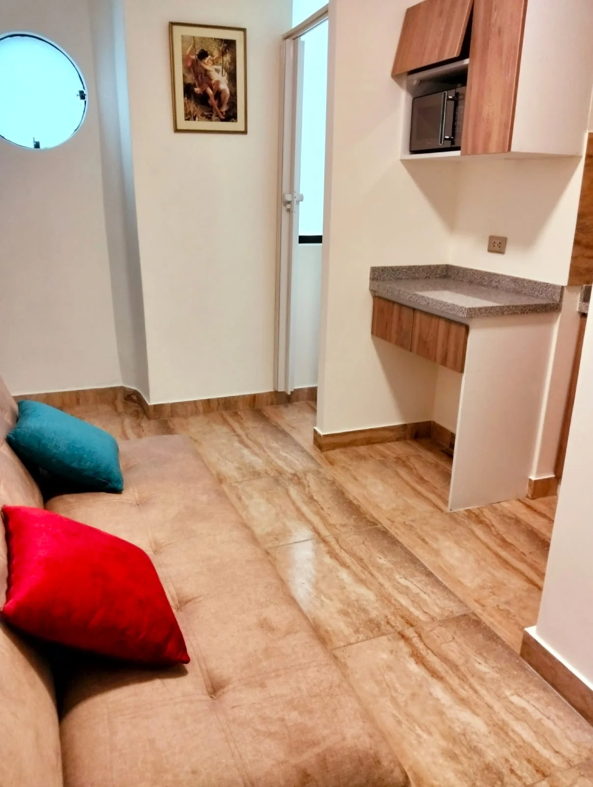与 2床2人, 1张大床+1号广场,1½起居室的小厨房家具、酒吧、家庭用品的迷你酒吧、微波炉烧水壶;结合的舒适性和实用性在一个现代化的环境和欢迎,理想的 家庭,朋友,或企业管理人员 有同伴 在寻找住宿多米拉弗洛雷斯,利马。